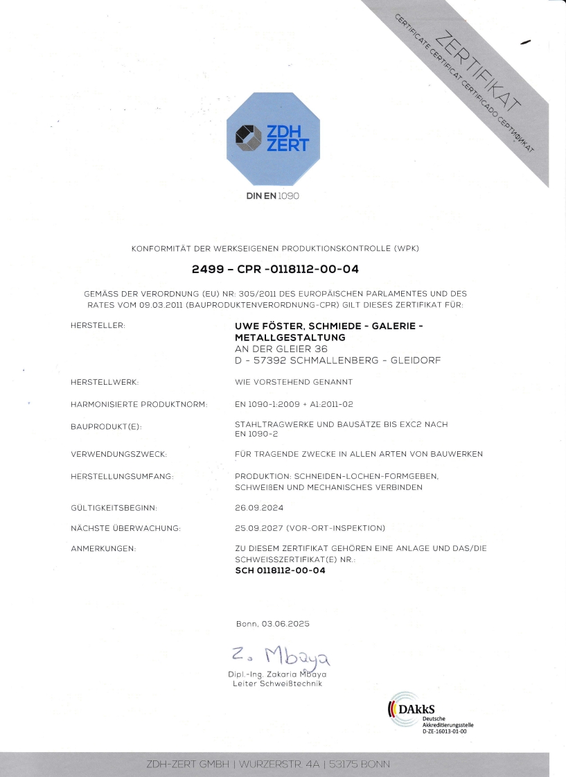 Zertifizierung nach DIN EN 1090 Die hohen Investitionen in Maschinen und Ausbildung der Mitarbeiter hat sich in der Zertifizierung nach DIN EN 1090 niedergeschlagen. Wir dürfen und können Projekte bearbeiten, die nicht jeder schafft.